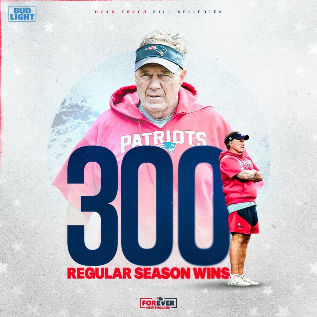Con la victoria de este domingo de los Patriots 29 – 25 sobre los Bills de Búfalo, el entrenador Bill Belichick consiguió su victoria número 300 en temporada regular.